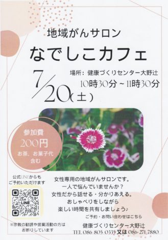 お知らせ2024.07.157/20(土) なでしこカフェ 地域がんサロン「なでしこカフェ」20日(土)10時30分~健康づくりセンター大野辻(岡山市)北海道の美味しいお菓子を持参します!ご都合が合えばぜひ!